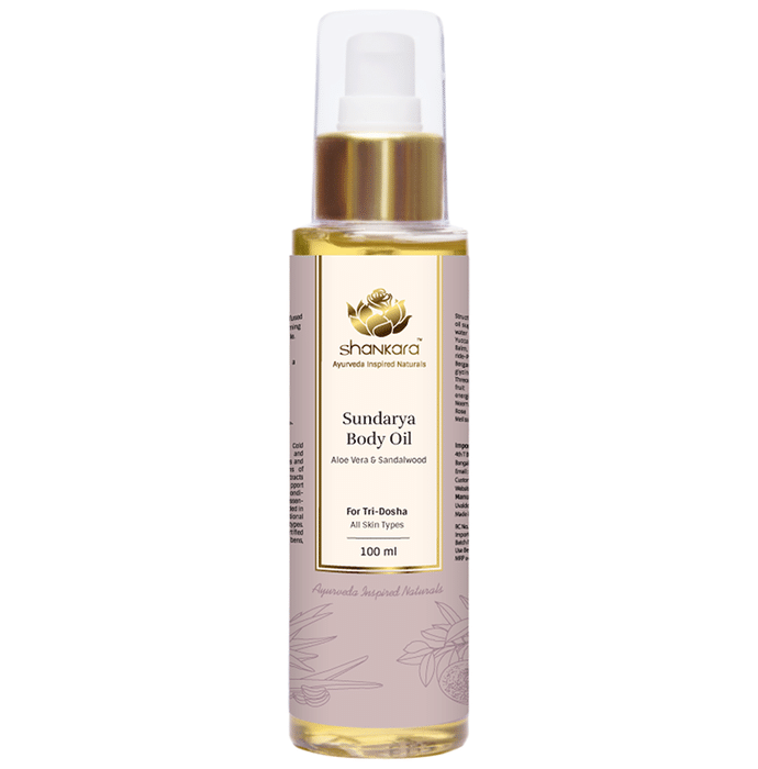Shankara Body Oil Its fragrance is mesmerizing and it increases the blood flow and relives the body of any aches or fatigue. It is primarily used to improve blood flow and to provide relief from the stress inflicted upon the body. It also nourishes the skin making it radiant and softer. | Key Ingredients: | Shankara Body Oil Sundarya Aloe vera Sandalwood | Shankara Body Oil Soothing Lavender Geranium | Shankara Body Oil Calming Cardamom Vetiver | Key Benefits: | Shankara Body Oil Sundarya Useful for treating body ache and general tiredness of the body Protects skin shrinks and keeps skin well-hydrated Helps to provide relief in stress and contains rich antioxidants | Shankara Body Oil Soothing It is rich in antioxidant, and repairs the damaged cells and protects them from further damage It helps to calm your nervous system and ease stress It keeps your skin moisturized and hydrated Lavender oil relives joint pains and other pains caused by sore muscles, join pain and sprains | Shankara Body Oil Calming Assists in removing the toxins from the Stomach and Gastrointestinal tract It helps improve digestion and also enhances appetite | Directions For Use: Use as directed on the label. | Safety Information: Read the label carefully before use Store in a cool dry place away from direct sunlight Keep out of reach of the children