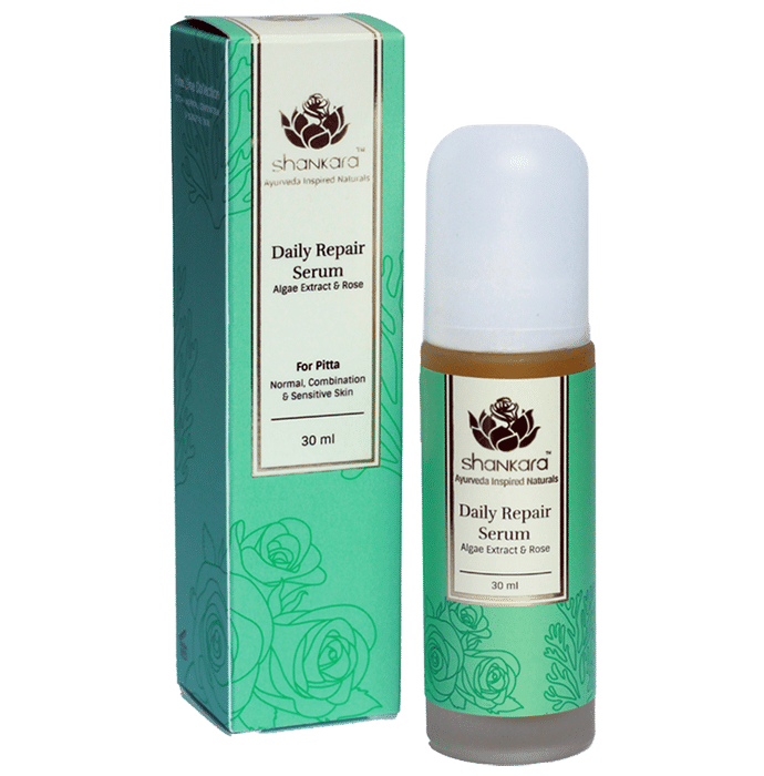 Shankara Daily Repair Serum For Pitta Shankara Daily Repair Serum gives your skin the hydration it craves with this Daily Repair Serum. Soothing rose and grapefruit seed extract along with algae extracts and amino acids has calming effect while replenishing vital moisture for hydrated, healthy skin. Shankara offers natural products that fuse the best of East and West to nourish your skin and restore your natural radiance.Revitalizes the skin amd makes it healthy.