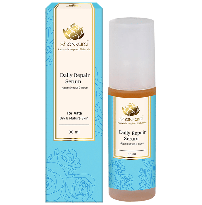 Shankara Daily Repair Serum For Vata Shankara Daily Repair Serum gives your skin the hydration it craves with this Daily Repair Serum. Soothing rose and grapefruit seed extract along with algae extracts and amino acids has calming effect while replenishing vital moisture for hydrated, healthy skin. Shankara offers natural products that fuse the best of East and West to nourish your skin and restore your natural radiance.Revitalizes the skin amd makes it healthy.