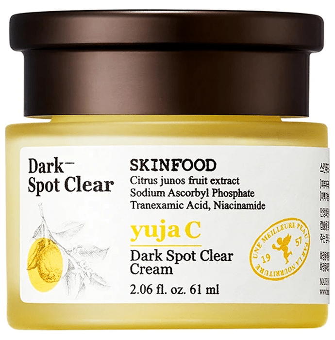 Skinfood Yuja C Dark Spot Clear Cream Skinfood Yuja C Dark Spot Clear Cream contains yuja extract and bursting glutathione vitamin capsules that help reduce the appearance of dark spots and hyperpigmentation. Niacinamide and sodium ascorbyl phosphate help brighten the skin for a clear and glowing complexion. Yuja and the vitamin C of lemons help promote a bright and even face.