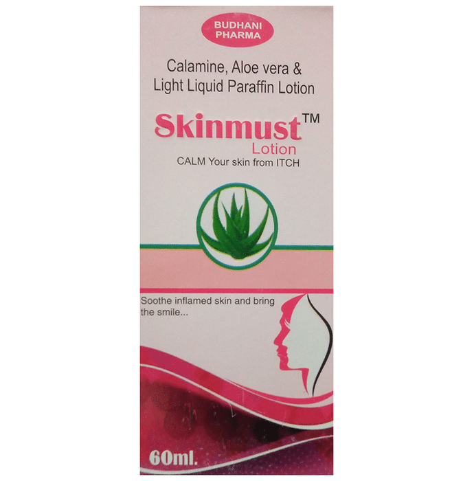 Skinmust Lotion is a moisturising lotion that helps soothe and calm the skin. It is fortified with calamine and aloe vera, which helps reduces itchiness and inflammation of the skin | Key Ingredients: Calamine Aloe vera Light liquid paraffin | Key Benefits: It helps provide relief from dry and itchy skin It helps soothe skin inflammation and irritation It helps moisturise and nourish the skin It makes the skin soft, smooth and healthy | Directions For Use: Use as directed on the label | Safety Information: Read the label carefully before use Store in a cool and dry place, away from sunlight Keep out of reach of children