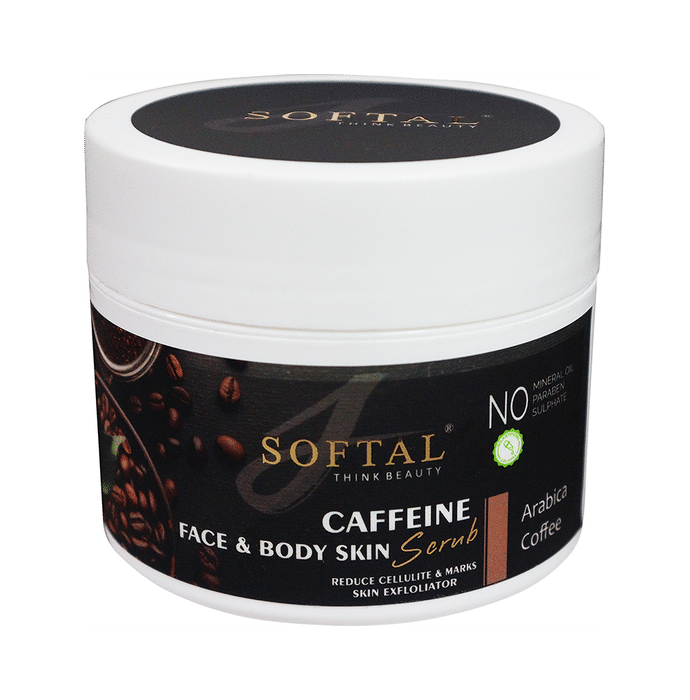 Softal Caffeine Face & Body Skin Scrub Softal Caffeine Face & Body Skin Scrub is packed with the goodness of coffee powder which polishes the skin and removes dead cells from the skin. Coffee face scrub reduces dark spots and clears out blackheads. It works effectively on rough and uneven skin, early signs of ageing and scars.