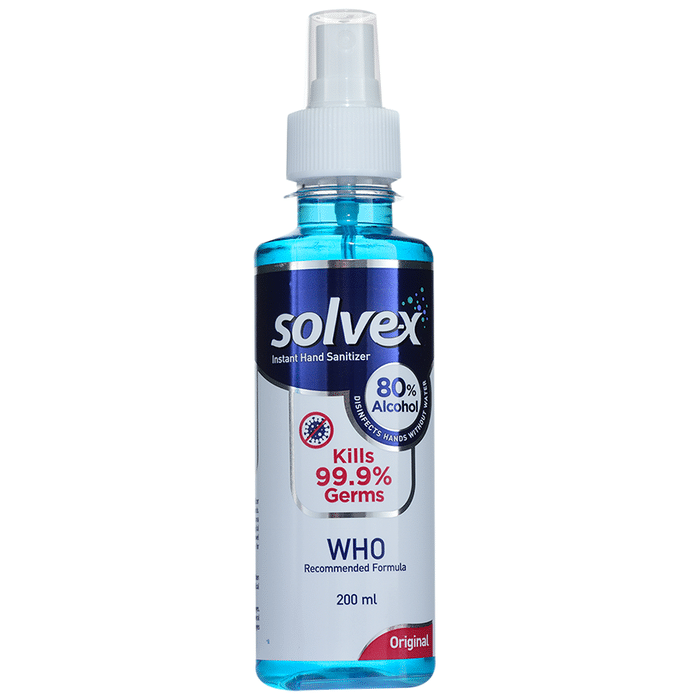 Solvex Instant Hand Sanitizer Spray 80% Alcohol (200ml Each) Original instantly kills 99.9% of disease-causing germs and has advanced moisturization qualities. The sanitiser spray is made easy and safe to use and has 80 per cent WHO recommended alcohol content. The sanitiser also has a delightful natural scent that makes your hands feel fresh. | Key Ingredients: Ethanol Glycerol Hydrogen peroxide Purified water | Key Benefits: This hand sanitiser spray kills 99.9% of germs It moisturises the hands and prevents dryness The non-sticky, moisturizing formula keeps the hands soft Handy, compact and easy to carry around | Directions For Use: Use as directed on the label. | Safety Information: Read the label carefully before use Store in a cool and dry place away from direct sunlight Keep out of reach of children