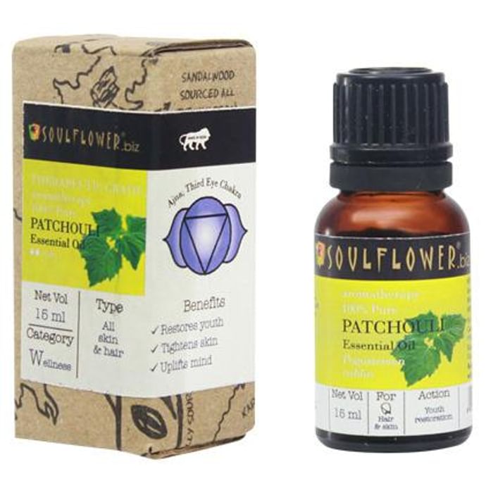 Soulflower Patchouli Essential Oil helps to restore the skin elasticity, lightens the scars, stretch marks, and conditions dry and chapped skin. It is also useful in controlling acne, scalp sebum secretion, and dandruff. | Key Ingredient: Patchouli | | Key Benefits: Useful for skin and beneficial for hair and nails Helps with scalp oil balance and dandruff control It reduces scalp itchiness and effective for fungal infections It conditions the nails, helps to get rid of painful hangnails and nail fungus. | Directions For Use: Mix Soulflower Patchouli Essential Oil with any Soulflower carrier oil before applying on hair & skin. Massage gently. Add 2-3 drops to olive oil for nail care. Diffuse or apply a small amount to your pillow to relax and calm your mind aromatically. | Safety Information: Read the label carefully before use Keep out of the reach of children Store in a cool dry place away from sunlight and heat