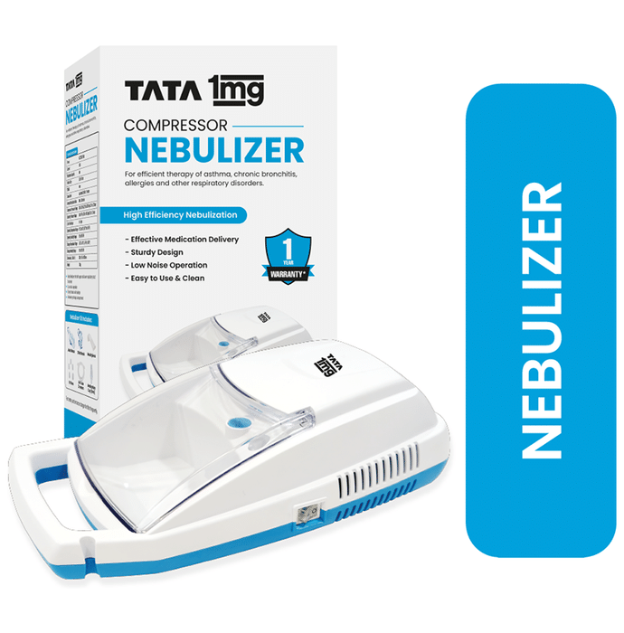 Tata 1mg Compressor Nebuliser is an easy-to-use device that is effective in the treatment of asthma, chronic bronchitis, allergies and other respiratory disorders. The nebuliser comes with the nebulisation kit, which includes an adult mask, child mask, mouthpiece, 5 filters, air tube (2 meters), and medication cup along with the compressor instruction manual. | Uses: It is primarily used in the treatment of asthma, chronic bronchitis, allergies and other respiratory disorders. | Product Specification and Features: Its one-button operation makes it easy to use The nebuliser provides fast medication delivery It has a low-noise design that makes it super quiet It is compact and designed to deliver medication to air passages It is an ideal Nebulizer for both upper and lower respiratory tract treatment It is suitable for children and adult-us It comes with an inbuilt storage unit It has a 1-year warranty (refer to the warranty guidelines from the manual) | Nebulization kit includes : Adult mask, Child mask, Mouthpiece, 5 filters, Air tube ( 2 meters), Medication cup | Directions For Use: Place your compressor nebulizer on a flat stable surface Remove the vial from the foil pouch Fill the bottom section of the nebulizer with the medication prescribed by your doctor Connect the nebuliser reservoir to the mouthpiece or face mask Sit in a comfortable and upright position, place the mouthpiece in the mouth and turn on the compressor Breathe as calmly, deeply and evenly as possible until no more mist is formed in the nebuliser chamber Switch off the compressor and unplug from the eclectic outlet Clean the nebuliser For a detailed procedure, cleaning, and safety, please refer to the instruction manual kept inside the pack | Nebulizer: A nebulizer is warranted to be free of defects in materials and workmanship for a period of 1 year from the date of original purchase This warranty does not apply to the performance of any Nebulizer that has been damaged by accident or has been altered, misused, or tampered with in any way Warranty is only on Machine (not applicable for accessories) | Safety Information: For better performance change the filter frequently Read the label carefully Keep out of reach of children Store in a cool and dry place