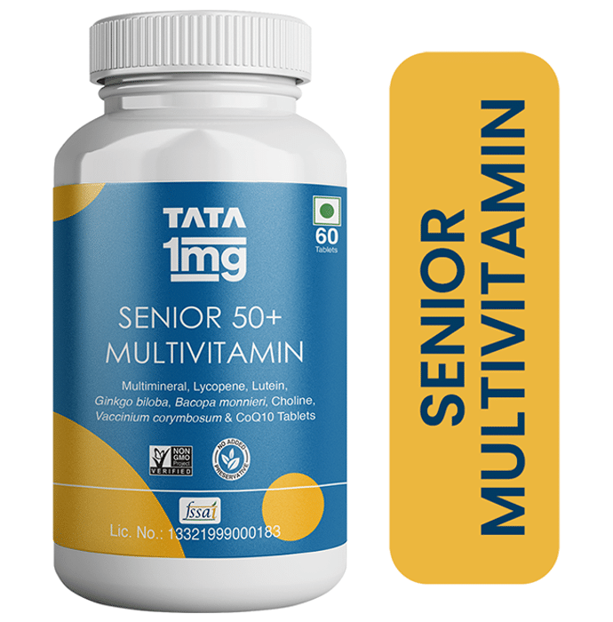 Tata 1mg Senior 50+ Multivitamin & Multimineral Immunity Booster Zinc, Vitamin C, Calcium, and Vitamin D Veg Tablet is a health supplement that contains 24 essential vitamins and minerals to fulfil the need for micronutrients in older adults. It may improve the immune system and support overall health. General health blend may enhance memory, prevent ageing, and support eye and heart health. | Key Ingredients: | Vitamins: Vitamin C, Vitamin B3, Vitamin E, Vitamin B5, Vitamin B2, Vitamin B6, Vitamin A ( Beta -Carotene), Vitamin B1, Vitamin B9 (Folic acid), Vitamin B7 (Biotin), Vitamin K1, Vitamin D2, and Vitamin B12 | Minerals: Calcium, Potassium, Chloride, Magnesium, Phosphorus, Zinc, Manganese, Copper, Iodine, Chromium, Selenium | General Health Blend: Coenzyme-Q10, Choline, Ginkgo biloba leaves ext. - 24%, Brahmi (Bacopa monnieri) leaves ext.- 20%, Glycosides, Bacosides Blueberry (Vaccinium corymbosum) fruit ext.- 25%, Anthocyanidin, Lycopene powder, and Lutein | Key Benefits: Helps to enhance memory Aids in improving the immunity level Supports eye and heart health It may help slow down the ageing process Supports general health and well-being | Effects of Deficiency: Lack of multivitamins and multiminerals can cause: Weak immune system Ageing faster Low energy | Product Form: Tablet | Directions for Use: One tablet per day or as directed by the healthcare practitioner | Safety Information: Read the label carefully before use Keep out of the reach of children Pregnant/lactating women and children with a medical condition should consult a physician before use Do not exceed the recommended daily dosage This product is not intended to diagnose, treat, cure or prevent any disease Store in a cool, dry place and away from direct sunlight | Quick Tips: Including fresh vegetables and fruits in the diet can provide additional benefits.