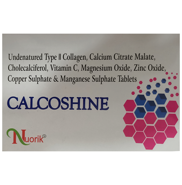 Calcoshine Tablet aids in the management of bone-related issues such as joint pain and inflammation. It contains vitamin D3, which aids in bone and muscle strength and may help reduce swelling. It also contains vitamin C, which supports the immune system and fights free radicals. | Key Ingredients: Undenatured collagen Type II Calcium citrate malate Vitamin D3 / Cholecalciferol Vitamin C / Ascorbic acid Magnesium oxide Zinc Oxide Copper sulphate Magnesium sulphate | Key Benefits: Calcoshine Tablet is beneficial in managing bone-related issues such as pain and inflammation of joints It contains vitamin D3 which helps in strengthening bones and muscle and may help reduce swelling It also contains vitamin C which helps in boosting the immune system and combats free radicals | Directions For Use: Use as directed on the label or as advised by your physician. | Safety Information: Read the label carefully before use Do not exceed the recommended dosage Store in a cool and dry place away from direct sunlight Keep out of reach of children