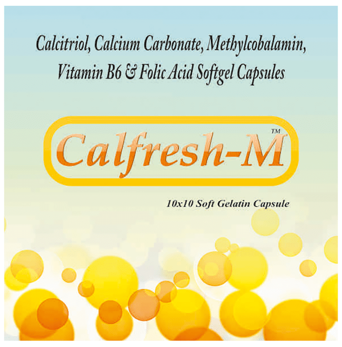 Calfresh M Capsule helps to increase bone density. Folic acid, which is present in it, may help maintain cardiac health and lower the risk of cardiac problems. Additionally, it aids in the formation of red blood cells and supports nerves. | Key Ingredients: Calcitriol Calcium carbonate Methylcobalamin Vitamin B6 Folic acid | Key Benefits: Calfresh M Capsule is beneficial for providing support to the bones and aids in enhancing bone density It contains folic acid, which may help in maintaining cardiac health and reduces the risk of cardiac issues It may also aid in supporting nerves and helps in the formation of red blood cells | Directions For Use: Use as directed on the label or as advised by your physician. | Safety Information: Read the label carefully before use Do not exceed the recommended dosage Store in a cool and dry place away from direct sunlight Keep out of reach of children