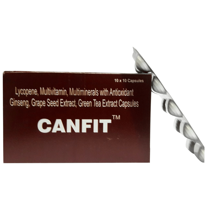 Canfit Capsule is a multivitamin capsule that helps replenish the body's vitamins and minerals. It contains natural ginseng, which keeps you energised throughout the day and increases stamina and energy levels. | Key Ingredients: Lycopene Ginseng Grape seed extract Green tea extract | Key benefits: It contains antimicrobial, antifungal and anti-inflammatory properties, which help to repair damaged hair, fight hair fall and delay premature greying It contains natural ginseng, which allows you to stay active and energised all day Grape seed extract act as an antioxidant, protecting cell from toxins, radical and pollutant Green tea extract is beneficial in high cholesterol, atherosclerosis, macular degeneration, poor circulation, and nerve damage It improves the health and overall well-being of the body | Direction For Use: As prescribed by the physician | Safety Information: Keep away from direct sunlight Store in a cool and dry place Keep out of the reach of children Read the label carefully before use