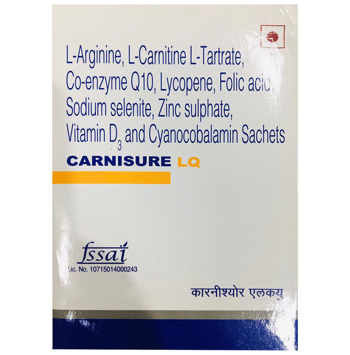 Carnisure LQ Powder may be useful for cell growth and maintenance. It also acts as an antioxidant that protects the body from various damaging effects of oxidizing molecules. It prevents sperm DNA fragmentation and improves sperm DNA quality and enhances the chances of fertility. It may help improve cardiovascular health. | Key Ingredients: L Arginine L Carnitine Coenzyme Q10 Folic acid Lycopene Sodium selenite Zinc sulphate | Key Benefits: It prevents sperm DNA fragmentation and improves sperm DNA quality and enhances the chances of fertility It helps the body turn fat into energy and is important for heart and brain function, muscle movement and many other processes It is essential for the immune system’s proper functioning and is vital in building and repairing tissue It is effective in relieving stress and helps enhance vigour and vitality in men It is used as a natural remedy for enhancing performance, building immunity and promoting weight management | Directions For Use: Read the label carefully before use. | Safety Information: Read the label carefully before use Store in a cool and dry place away from direct sunlight Keep out of reach of children
