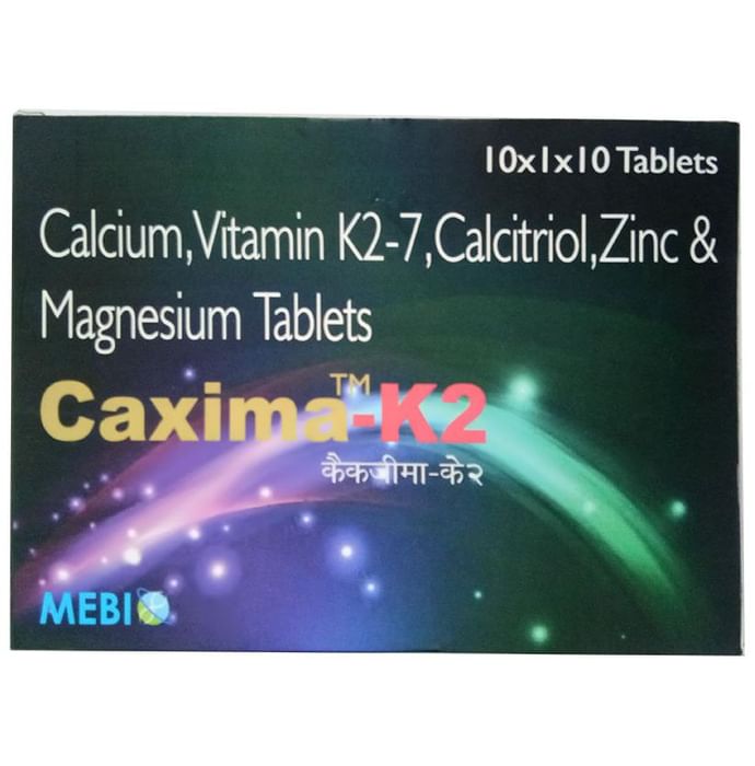 Caxima K2 Tablet is recommended for general sluggishness, weakness, lethargy, exhaustion, irritability, low immunity, convalescence, and as a supplement for chronic illnesses. All of these elements work together to improve the health state and have a concentrated action. Several components improve the blood flow and oxygen saturation. The organs and tissues obtain adequate amounts of nutrients from the tablet. | Key Ingredients: Calcitriol Calcium Vitamin K2-7 Zinc Magnesium | Key Benefits: This capsule is indicated in general debility, weakness, lethargy and fatigue It enhances the immunity of the body It may be used in cases of chronic illness Calcium helps to promote bone health It nourishes the body for its proper development and growth | Directions For Use: As mentioned on the label Or as advised by your healthcare practitioner | Safety Information: Read the label carefully before use Store in a cool and dry place, away from sunlight Keep out of reach of children