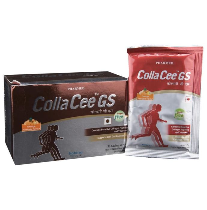 Collacee GS Sugar Free Granules Orange Pineapple Collacee-GS Sachet contains Collagen peptide, Glucosamine and Vitamin C In osteoarthritis, collagen based nutritional supplement have a very good role to play. Collagen is a major constituent of Bone Cartilage and loss of Collagen leads to Cartilage damage and Osteo-arthritis.Collagen Peptides supplementation has important role in preventing and treating Osteo-Arthritis.Collagen peptides regenerates cartilage by increasing proliferation of proteoglycans and Chondrocytes. It provides strength in load bearing bones therefore, improves flexibility of joints and suppresses pro-inflammatory cytokines IL-1 and TNF-alpha, therefore, reduces inflammation. Besides Collagen peptides, Glucosamine and Vitamin C helps in regeneration of cartilage and thus gives relief in Osteoarthritis. Directions of use: Empty the sachet in a glass. Add 100 ml of water, mix and consume it after meals. Use under medical supervision.