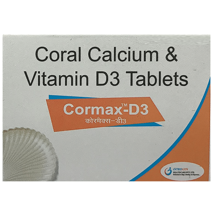Cormax-D3 Tablet is a tablet which contains calcium and vitamin D3. This combination can be given to patients who do not get enough calcium from their diet. Coral Calcium is used to deal with low calcium levels in the blood, such as bone loss, weak bones and certain muscle diseases. | Key Ingredients: Coral calcium Vitamin D3 | Key Benefits: This product can aid in the normal functioning of nerves, cells, muscle and bone It contains vitamin D, which helps absorb calcium and phosphorus in the body It can help in keeping the bones strong and maintain good bone health | Directions For Use: Use as directed on the label or as advised by your healthcare provider. | Safety Information: Read the label carefully before use Store in a cool and dry place away from direct sunlight Keep out of reach of children