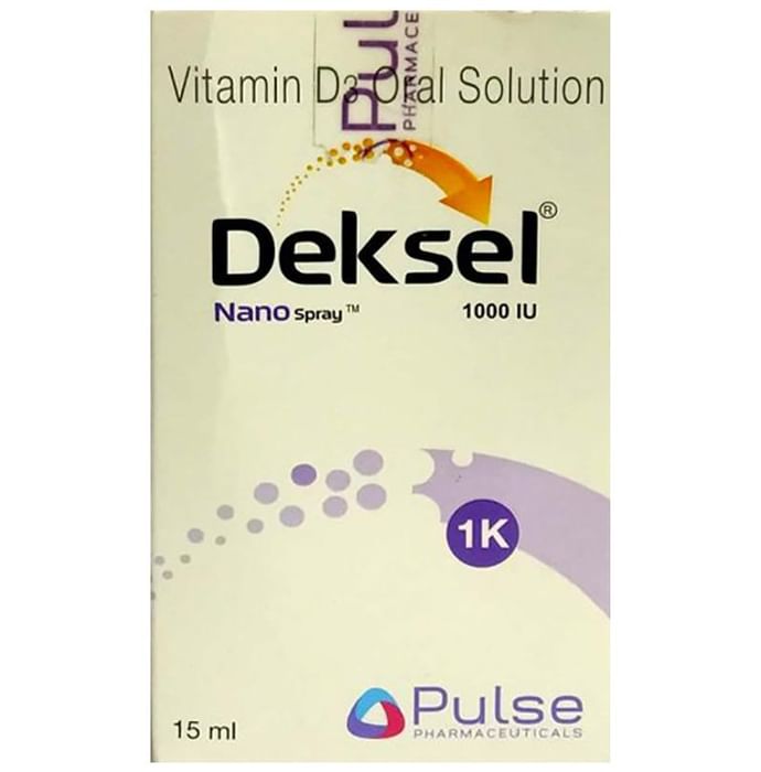 Deksel 1000IU Nano Spray contains Cholecalciferol, a form of Vitamin D which can help promote the absorption of calcium, phosphates, and vitamin A from different organs and help in maintaining overall health. It may help fulfil vitamin D requirements. | Key Ingredients: Cholecalciferol IP 1000 IU | Key Benefits: It can help meet the daily vitamin D requirements It may promote calcium and phosphate absorption It can support bone health | Directions For Use: Use as directed by the physician. | Safety Information: Read the label carefully before use Store in a cool and dry place Keep out of reach of children