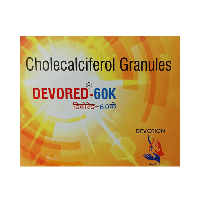 Devored 60K Granules provide vitamin D3, also known as cholecalciferol. It is an essential nutrient to maintain healthy bones and teeth, promote neuromuscular and immune health, regulate blood pressure, protect the heart and support insulin secretion. Vitamin D is required for calcium absorption from foods. | Key Ingredients: Cholecalciferol | Key Benefits: It is a dietary aid to compensate for vitamin D deficiency It supports the formation and maintenance of healthy bones It promotes weight management | Directions For Use: Take 1 tablet a day or as directed by the physician. | Safety Information: Read the label carefully before use Do not exceed the recommended dosage Store in a cool and dry place away from direct sunlight Keep out of reach of children