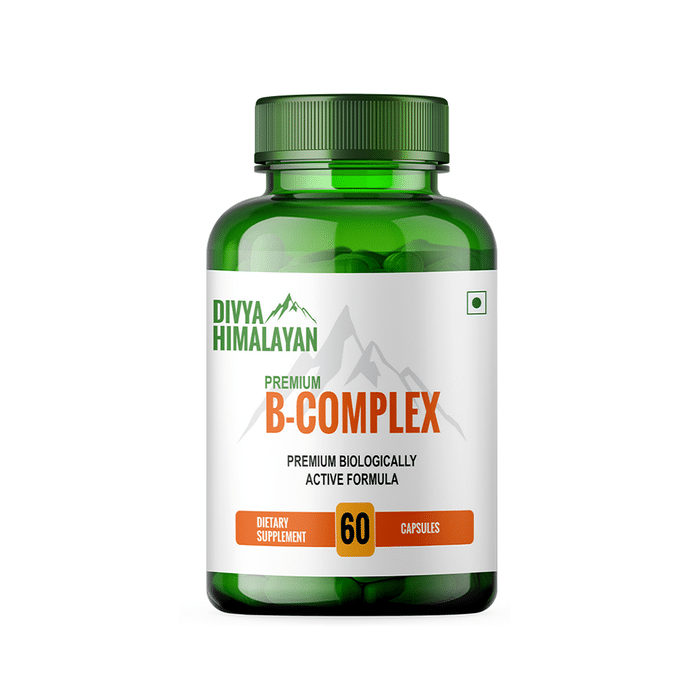 Divya Himalayan Premium B Complex Capsule It is a dietary supplement formulated with all B vitamins that support an individual’s immune health and overall well-being. Most B vitamins are involved in the process of converting food into energy. Vitamin B promotes healthy brain functions and improves cognition, memory and intelligence. Vitamin B12 plays an essential role in the formation of red blood cells and the prevention of anaemia. Vitamin B complex is rich in antioxidants that protect the body against free radicals while strengthening the immune system. | Key Ingredients: Vitamin B1 (Thiamine) Vitamin B2 (Riboflavin) Vitamin B3 (Niacin) Vitamin B5 (Pantothenic acid) Vitamin B6 (Pyridoxine) Vitamin B7 (Biotin) Vitamin B9 (Folic acid) Vitamin B12 (Cobalamin) | Key Benefits: It is a dietary supplement formulated with all B vitamins that support an individual’s immune health and overall well-being Most B vitamins are involved in the process of converting food into energy and enhancing metabolism Vitamin B12 plays an essential role in the formation of red blood cells and supports healthy bones Vitamin B complex is rich in antioxidants that protect the body against free radicals while strengthening the immune system Vitamin B promotes healthy brain functions and improves cognition, memory and intelligence Vitamin B complex helps to reduce skin inflammation, redness, dryness and acne It is essential for healthy skin, hair and nails | Directions For Use: Take 1-2 capsules twice a day after meals or as directed by your physician | Safety Information: Read the product label carefully before use Store in a cool and dry place away from direct sunlight Keep out of reach of children Consult a doctor before taking any supplement Do not exceed the recommended dosage Pregnant or nursing mothers, children, and people with medical conditions must consult a physician before taking this supplement Do not use if the product appears to be tampered with or the seal is broken