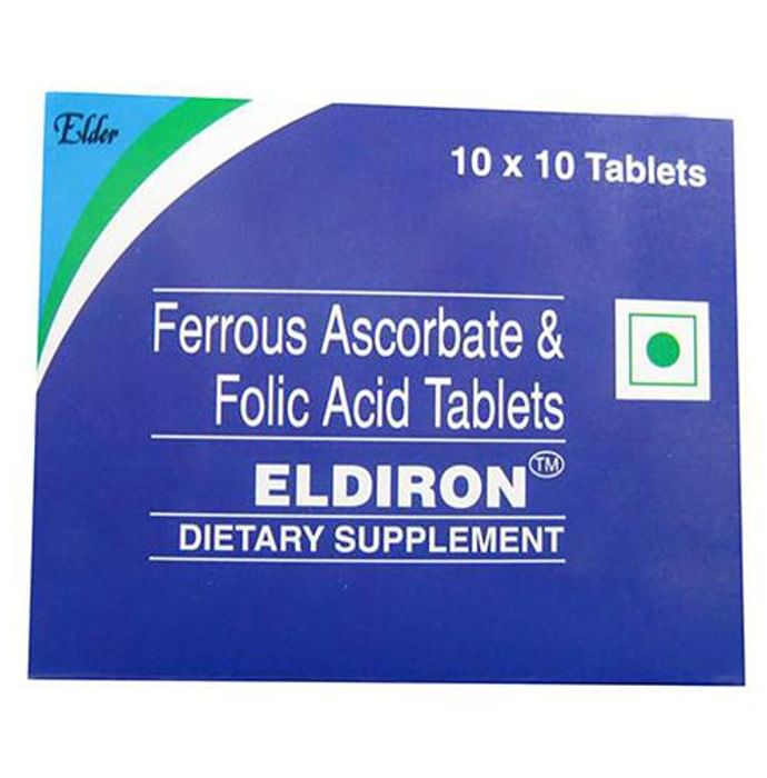 Eldiron Tablet is taken along with healthy diet to cure the deficiency of iron and vitamins in the body. The presence of ferrous formulate cures anaemia and increases the capacity of the body to absorb more iron from the food eaten. Folic acid in the tablets makes healthy red blood cells. The medicine is available on doctor’s prescription. It is taken orally and can have some or the other side effects therefore, it is advised to take under supervision. | Key Ingredients: Folic Acid Elemental iron | Key Benefits: Used to cure anaemia effectively Supplements iron deficiency in body Used as a dietary supplement to increase haemoglobin | Direction for use: Generally recommended to take one tablet daily after meals Consult the doctor before use | Safety Information: Read the label carefully before use Keep it out of reach of the children Store in a cool and dry place away from direct sunlight Use under medical supervision