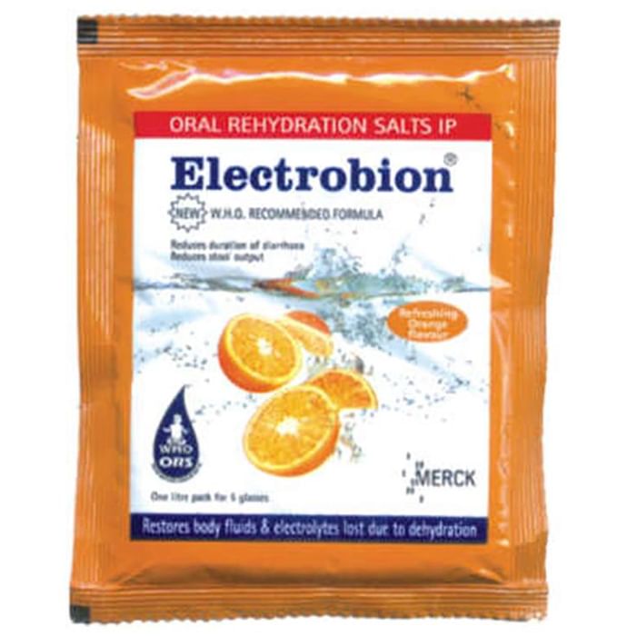 Electrobion Powder Orange Electrobion Orange Sachet contains Sodium Chloride, Sodium Citrate, Potassium Chloride, and Dextrose. Role of key ingredients: Sodium Chloride is important mineral to maintain fluid balance in the human body and used for treating and preventing sodium loss caused by dehydration.. Potassium Chloride is vital for normal functioning of the human body and is used as an electrolyte replenisher. Dextrose is the source of glucose to provide energy. Electrobion Orange Sachet is used for the electrolyte deficiency and imbalance, severe diarrhea, and dehydration. Directions for use: 1. Dissolve the contents of the packet in the amount of drinking water indicated on the packet. 2. If drinking water is not available, or if you are not sure the water is drinkable, boil the water for at least 10 minutes and then let cool. 3. Stir well, and give to the child to drink in a cup or spoon feed. Use under medical supervision.