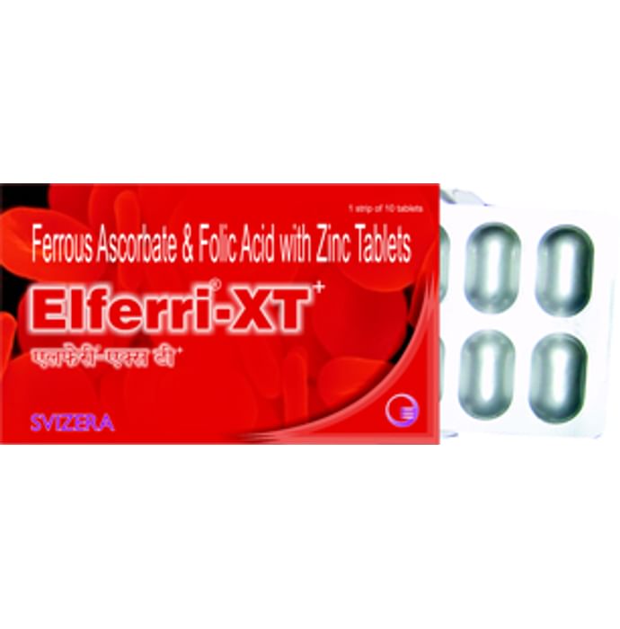 Elferri -XT Tablet Elferri XT tablet contains Ferrous ascorbate,Folic Acid,Vitamin B12 and Zinc Ferrous Gluconate offers higher absorption and improves hemoglobin level. Iron transports oxygen throughout the body and maintains red blood cells, thus making an individual feel energetic and preventing anemia. Folic acid is essential to numerous bodily functions ranging from nucleotide biosynthesis to the remethylation of homocysteine. Both children and adults require folic acid to produce healthy red blood cells and prevent anemia. Zinc sulphate and Vitamin B12 are of particular importance during pregnancy. Whereas, Zinc is essential for normal foetal growth. Vitamin B12 promotes the initiation and maturation of blood cells supporting the pregnancy. Usage: Prevention of iron deficiency Anemia Post Surgery Dysfunctional Uterine Bleeding Kidney Disease Direction for use:- Elferri XT tablet can be taken orally with water, after meals. Use under medical supervision.