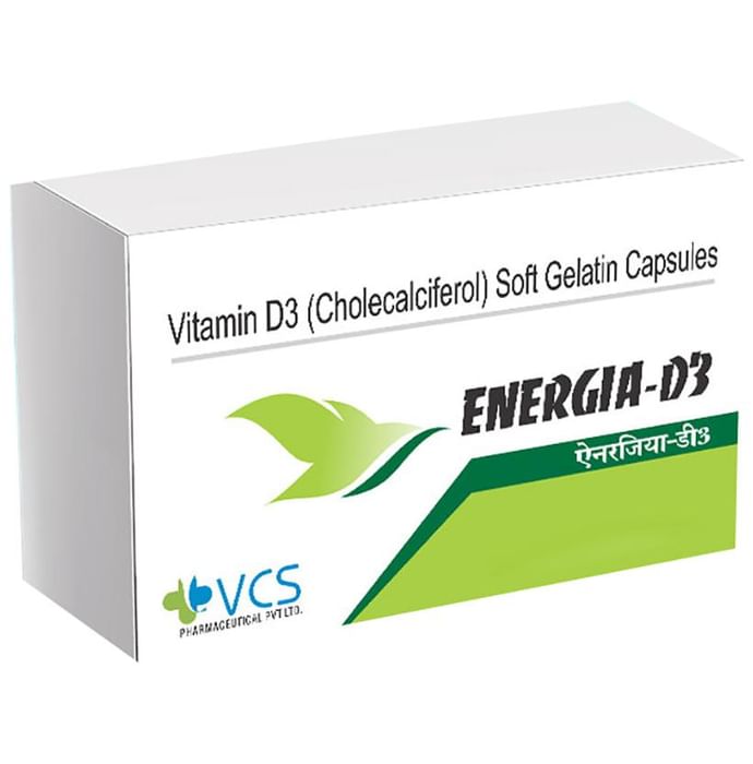 Energia-D3 Soft Gelatin Capsule is a combination of different vitamins typically found in foods. | Key Ingredients: Vitamin D3 | Key Benefits: It helps boost energy and vitality, enhances immunity and supports bone health It improves energy levels, memory, skin and hair health and stimulates the immune system It enhances memory and concentration and supports cardiovascular functions It helps to keep nails, hair, skin, liver and nervous system healthy | Directions For Use: Use as directed on the label or as advised by your healthcare provider. | Safety Information: Read the label carefully before use Store in a cool and dry place away from direct sunlight Keep out of reach of children