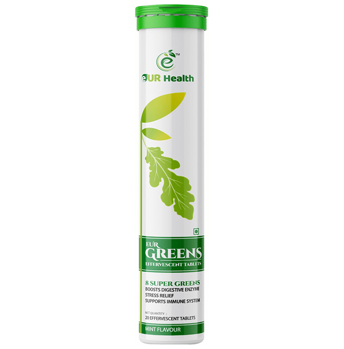 Eur Health Greens Effervescent Tablet Mint contains natural ingredients that help to rejuvenate the body. It may boost the digestive enzyme and minimise stress. | Key Ingredients: Organic green blend Eternal- sodium Potassium Zinc Iron Vitamin -C, B3,B5,B6,B12 | Key Benefits: It supports the immune system It is beneficial for overall health It has no side effects It may boost the digestive enzyme and minimise stress | Directions For Use: Take two tablets daily after meals for 60 days for better results. | Safety Information: Read the label carefully before use Store in a cool dry place Do not use if the seal is broken or missing