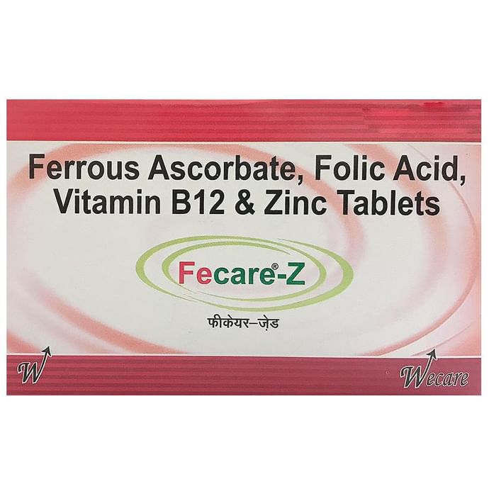 Fecare Z Tablet is a formulation that can help prevent iron deficiency due to chronic blood loss or low intake of iron and may help transport oxygen throughout the body. It can aid in maintaining red blood cells and keeping the body active and energetic. It can also help with anaemia management. | Key Ingredients: Ferrous ascorbate Folic acid Vitamin B12 Zinc | Key Benefits: This product can aid in maintaining good neurological health It may help in dealing with iron deficiency due to chronic blood loss or low intake of iron It can help to preserve various key functions of the body such as maintaining energy levels, improving gastrointestinal functions and boosting the immune response | Directions For Use: Use as directed on the label or as advised by your healthcare provider. | Safety Information: Read the label carefully before use Store in a cool and dry place away from direct sunlight Keep out of reach of children