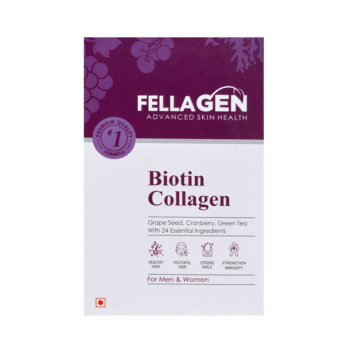 Fellagen Biotin Collagen Tablet Fellagen Biotin Collagen Tablet Boldfella’s Fellagen is enriched with the goodness of biotin and collagen along with 28 other essential nutrients that nourish your skin, hair and nails. The Fellagen consists of biotin, collagen, multivitamins, essential amino acids, and antioxidants.