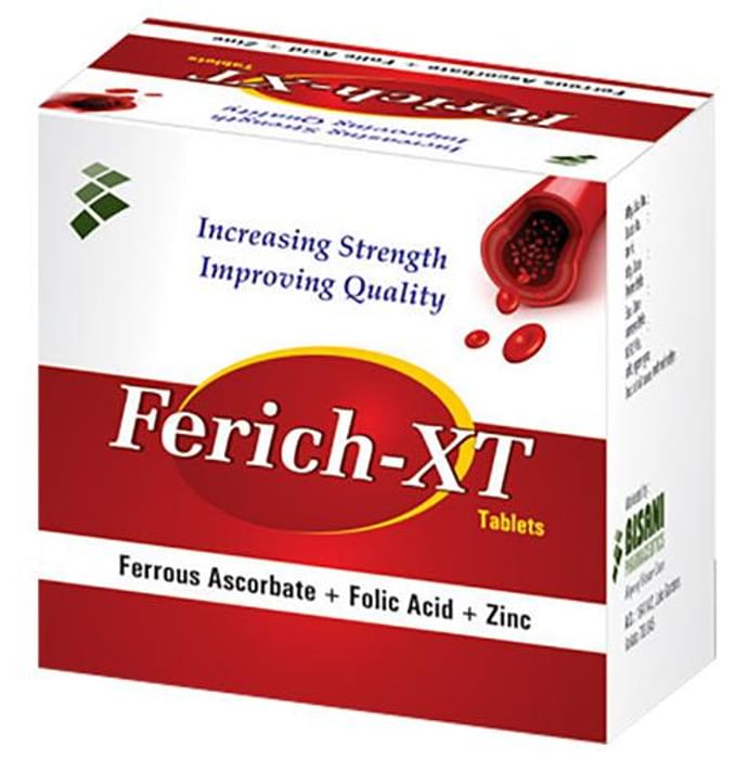 Ferich XT tablet contains elemental Iron and Folic Acid (vitamin B9). Folic acid is essential to numerous bodily functions ranging from nucleotide biosynthesis to the remethylation of homocysteine. It is especially important during periods of rapid cell division and growth. Both children and adults require folic acid to produce healthy red blood cells and prevent anemia. Iron transports oxygen throughout the body and maintains red blood cells, thus making an individual feel energetic and preventing anemia. Ferich XT tablet is used for the treatment of Iron deficiency anemia, Iron deficiency due to chronic blood loss or low intake of iron Iron deficiency anaemia and nutritional anaemia that occurs especially during pregnancy and lactation. Ferich XT can be taken orally with water, after meals. Use under medical supervision.