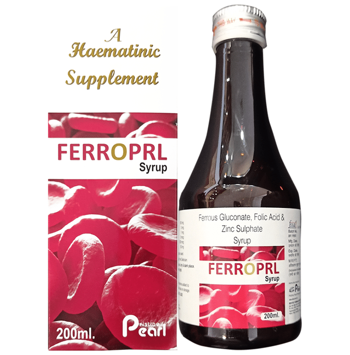 Ferroprl Syrup is an iron nutritional supplement with folic acid and zinc sulphate and other vitamins that improve haemoglobin levels. | Key Ingredients: Ferrous gluconate Thiamine Pyridoxine Vitamin B12 Folic Acid Zinc Sulphate | Key Benefits: An iron nutritional supplement with folic acid and zinc sulphate and other vitamins that improve haemoglobin levels Ferroprl Syrup is ideal for anaemic patients | Directions For Use: Take 5 ml twice a day or as directed by the physician. | Safety Information: Read the label carefully before use Keep out of reach of the children Store in a cool dry place
