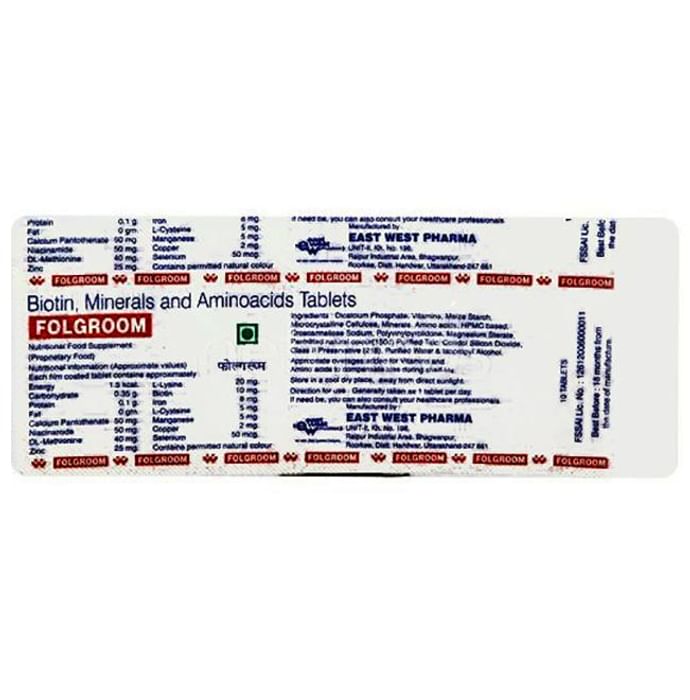 Folgroom Tablet has calcium in it, which helps to increase bone and muscle strength and control blood pressure levels. Additionally, it also contains niacin, which supports healthy nerve and digestive functions. | Key Ingredients: L-Methionine Calcium L-Selenium Niacin L-Cysteine | Key Benefits: Folgroom Tablet is beneficial for providing nutritional support to the body with its multivitamins and minerals It contains Calcium which helps in boosting muscle and bone strength and regulates blood pressure levels It also contains Niacin which aids in boosting nerve functions and also helps in promoting digestive health | Directions For Use: Use as directed on the label or as advised by your physician. | Safety Information: Read the label carefully before use Do not exceed the recommended dosage Store in a cool and dry place away from direct sunlight Keep out of reach of children