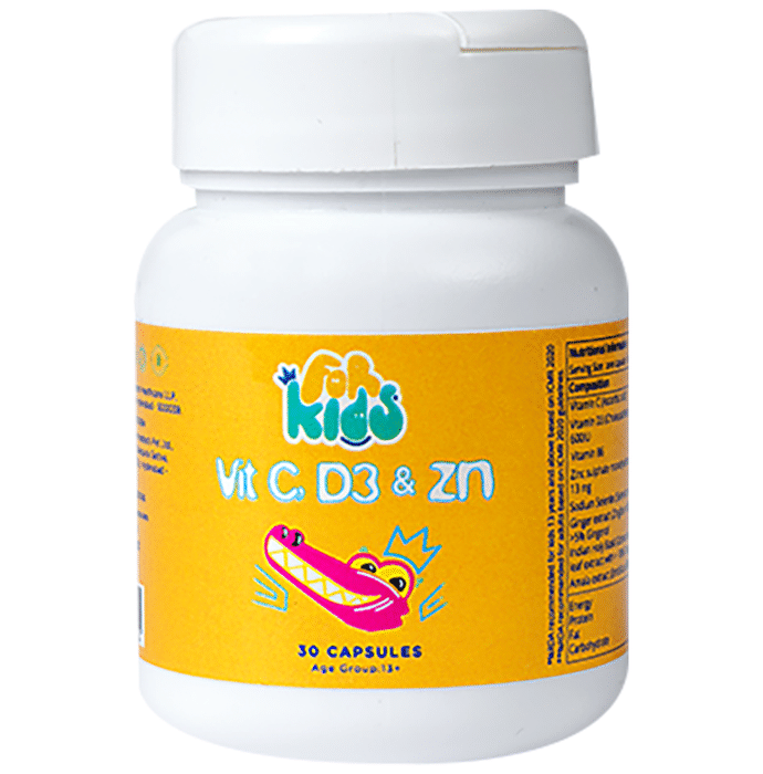 ForKids Vit C, D3 & Zn Capsule is formulated by experienced doctors and pharmacologists. It helps boost immunity and protects against viral and bacterial infections. It contains herbs that boost immunity naturally and offer maximum protection. | Key Ingredients: Vitamin C Vitamin D3 Vitamin B6 Selenium Zinc Tulsi extract Amla extract Ginger extract | Key Benefits: Effective and advanced formula Contains scientifically proven ingredients Helps in faster recovery and decreases the severity of infections Contains powerful antioxidant that removes harmful free radicals Essential for overall health and all organs of the body | Directions For Use: 1 tablet to be taken anytime everyday, regularly with a glass of water, preferably after food. | Safety Instructions: Read the label carefully before use Store in a cool dry place away from direct sunlight Keep out of reach of the children It is a natural product with no significant side effects