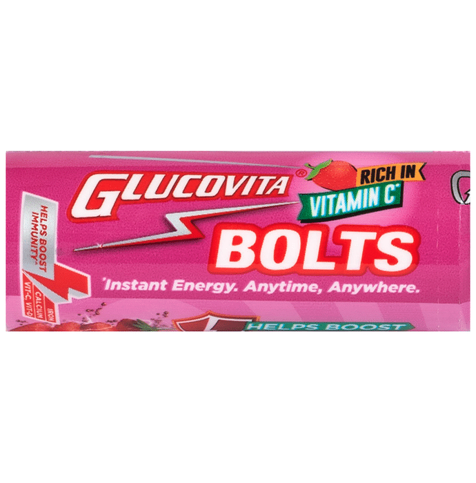 Glucovita Bolts Strawberry Glucovita Bolts are healthy and tasty energy tablets with glucose and iron which gives instant energy to the body and brain. The innovative and attractive pack is easy to carry and use. It contains essential vitamins and minerals that not only provide us instant energy but also help in replenishing minerals and salts in our bodies.