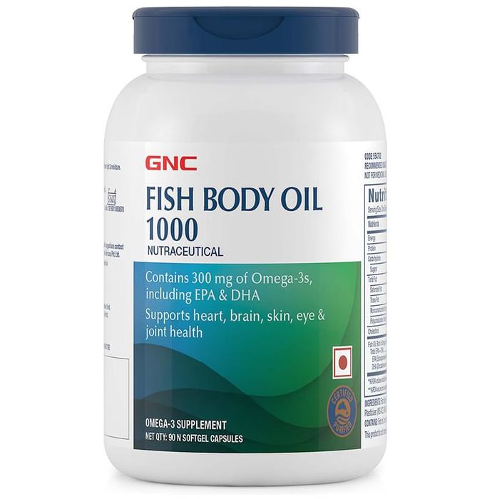 GNC Fish Body Oil 1000 Softgel Capsule Research on omega-3 fatty acids has led to the development of fish oil supplements. Supplements can help provide the recommended amount of EPA and DHA (forms of omega-3 fatty acids) to meet the requirements. ICMR recommends having a minimum of 250 to 2gm of EPA and DHA daily. These softgel capsules provide 1000mg of omega-3 fatty acids with 300mg of EPA and DHA. | Key Ingredients: Omega-3 fatty acids EPA DHA | Key Benefits: DHA can help support brain and eye health EPA may protect the heart, skin, and joints from inflammation The fish oil is derived from deep ocean fishes It might improve the overall health | Directions For Use: Take 1-2 capsules daily or as directed by the healthcare professional. | Safety Information: Read the label carefully before use Store in a cool and dry place Keep out of reach of children