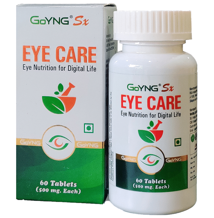 GoYNG Sx Eye Care Tablet is a daily eye care supplement for gadget tired eyes for people in front of screens for a long time. It may help maintain good eye health in this digital age and reduce age-related eye discomforts. This formulation of nutrients like vitamin A, lutein, bilberry, zeaxanthin, carrot extract, multivitamin, iron, can help repair eye damage due to ageing or screen exposure. | Key Ingredients: Vitamin a Iron Yastimadhu Billberry Carrot extract Lutein Zeaxanthin Multivitamins | Key Benefits: 10x eye protection with Lutemax 2020 (lutein and zeaxanthin): Lutein and zeaxanthin, also known as “eye vitamins”, are a type of carotenoids that might help filter harmful UV or blue rays emitting from digital screens They can help protect your eyes against harmful blue light, age-related vision problems and stress. These antioxidants can protect your eyes from free radical damage The goodness of carrot juice and orange juice extracts can act as a complete vision care supplement that might restore natural eye health Protects eyes from harmful blue light: GoYNG plant-based supplement for eyes can provide the essential nutrition to your eyes while supporting normal retinal function Relieves eye strain and fatigue: GoYNG eye care supplement contains clinically proven ingredients that might help relieve eye stress-strain, fatigue and inflammation. It can help to get rid of irritation in the eyes, dryness as well as age-related discomforts It does not have any side effects | Directions For Use: Take 1 tablet twice with lukewarm water 30 min before a meal or as directed by healthcare professionals | Safety Information: Read the label carefully before use Store in a cool and dry place, away from sunlight Keep out of reach of children Use under medical supervision Don’t exceed the recommended dosage
