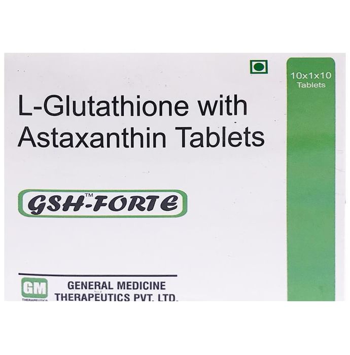 Gsh-Forte Tablet It is a health supplement used for various eye conditions like age-related macular degeneration, cataracts, post-Lasik recovery, glaucoma and retinitis pigmentosa. | Key Ingredients: L-glutathione Astaxanthin | Key Benefit: Protects the body from the damaging effects of free radicals Helps in breaking down free radicals and supports certain enzymes function It might help in tissue building and repair and plays an important role in maintaining a healthy immune system | Directions For Use: Use as directed on the label or as advised by your healthcare provider. | Safety Information: Read the label carefully before use Store in a cool and dry place away from direct sunlight Keep out of reach of children