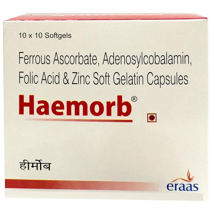 Haemorb Soft Gelatin Capsule is a dietary supplement containing Iron, Zinc and Folic acid as the active ingredients. Beneficial for people suffering from low levels of Iron, Zinc and Folic acid, it prevents several nutritional deficiencies and can be used to boost the immune system, treats anaemia and helps alleviate fatigue. | Key Ingredients: Ferrous Ascorbate Adenosylcobalamin Folic Acid Zinc | Key Benefits: Primarily used for the treatment of low levels of Iron, Zinc and folic acid Folic acid treats anaemia caused due to Vitamin C deficiency and maintains the growth of healthy new red blood cells in the body Iron can be used to boost energy levels to treat fatigue and helps boost immunity Zinc is essential in regulating immune functions and can be used to treat and prevent age-related chronic diseases | Directions for use: Take 1 capsule daily, preferably with meals or as directed by the physician. | Safety Information: A dietary supplement not intended for medicinal use Read the label carefully before use Do not exceed the recommended dose Keep out of the reach of children Store in a cool dry place away from direct sunlight and heat