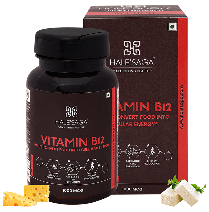 Halesaga Vitamin B12 1000mcg Capsule helps convert the consumed food into cellular energy. It increases the energy levels in the body and helps form red blood cells. It is quite beneficial in maintaining general vitality. | Key Ingredients: Vitamin B12 | Key Benefits: It aids in strengthening the nerves to boost the cognitive function It promotes the formation of red blood cells It helps maintain an excellent nervous system These capsules help fight stress and tension It helps in improving the cognitive abilities of the brain It is beneficial in maintaining the general vitality It can relieve constipation, diarrhoea, loss of appetite or gas It can help protect against cardiovascular and eye diseases | Directions For Use: Take one capsule twice a day For best results, take 20-30 minutes before the meal or as directed by your healthcareprofessional Do not exceed the recommended daily usage | Safety Instructions: Do not exceed the recommended dosage Keep the container tightly closed Do not use if seal is broken Store in a dry and dark place Store at the temperature not exceeding 25 Read the label carefully before use Keep out of reach of the children
