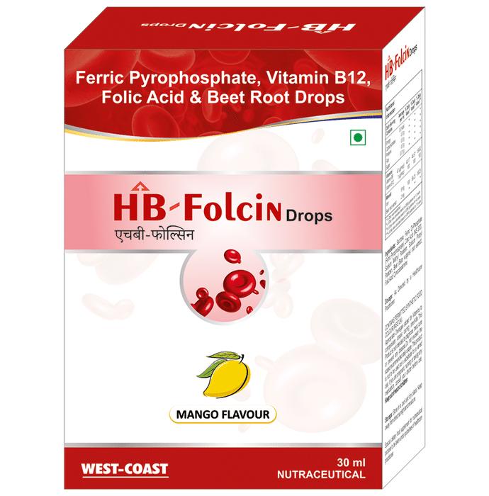 HB-Folcin Oral Drops Mango can help in red blood cell production and fulfil folic acid requirements of the body. It works by increasing red blood cells and haemoglobin production in the body to help increase oxygen supply. | Key Ingredients: Sucrose Ferric Di-Phosphate Citric acid Sodium Methyl Paraben Sodium Propyl Paraben Beet root extract Folic acid Cyanocobalamin | Key Benefits: It may provide iron to the body to aid in red blood cells production It can support oxygen transportation in the body It may help in the production of healthy new cells It can help keep the nervous system healthy | Directions For Use: Use as directed by the healthcare professional. | Safety Information: Read the label carefully before use Store in a cool and dry place Keep away from direct sunlight and moisture