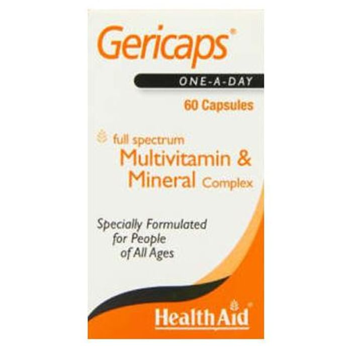 Healthaid Gericaps Capsule a highly potent and uniquely balanced combination of natural vitamins, minerals and trace elements. HealthAid Gericaps helps revitalise the body, enables a more active lifestyle, maximises energy levels, and helps reduce stress and exhaustion from the day to day routine. Key Benefits: Helps boost energy levels Aids in improving cardiovascular health Enhances blood circulation Eliminates toxins from the body and delays ageing Helps improve metabolism key Ingredients- Bulking Agent (di-calcium phosphate, soybean oil, vegetable shortening, yellow beeswax), Capsule Shell, Choline Bitartrate, Vitamin C, Inositol, Iron, L-Lysine, Niacinamide, Potassium Citrate, D-Calcium Pantothenate, Vitamin E, Potassium Iodide,Thiamine Mononitrate, Pyridoxine HCl, Riboflavin, Zinc Oxide, Manganese Sulfate, Vitamin A Palmitate, Cupric Sulphate, Magnesium Oxide, Folic Acid, Vitamin D2, Vitamin B12. Direction of use: Adults and children over 12years of age, one capsule daily with food. Do not exceed recommended daily intake unless advised by a suitably qualified person. Use under medical supervision