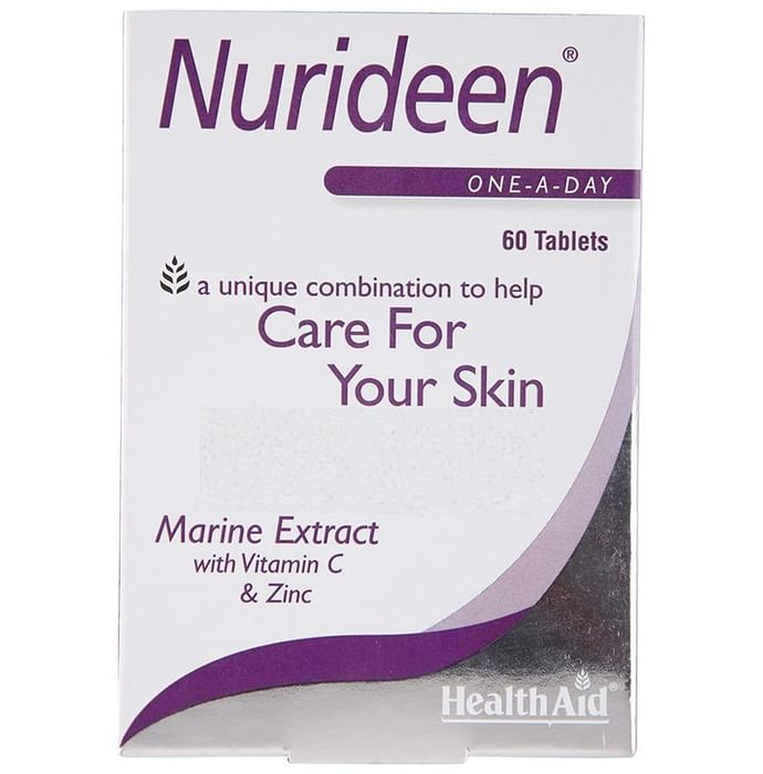 Healthaid Nurideen Tablet Healthaid Nurideen Tablets are an excellent specialized formulation which combines Shark Cartilage, Vitamin C and Zinc for healthy looking skin. Shark Cartilage contains high levels of mucopolysaccharides, similar to those found in the supportive layer of the skin,Vitamin C is a powerful antioxidant that plays a vital role in collagen production and helps protect the fibers that support skin structure; Zinc is an essential mineral that helps regulate the activity of the oil glands, which help keep the skin supple, smooth, soft and youthful looking. Key Benefits: Reduces the early signs of ageing Helps maintain youthful and supple skin Protects fibres that support skin structure Enhances collagen production Direction of use: One tablet daily (preferably mornings) with half a glass of water. To realise the product’s full potential - take for at least 3 months. Use under medical supervision