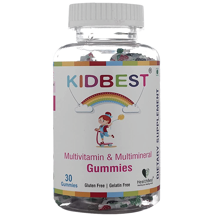 HealthBest Kidbest Multivitamin and Multimineral Gummies are delicious multivitamins that help to fill the nutritional gaps in the diet. It is an excellent source of nutrients, including vitamins A, C, D, E, B3, B6, B12, biotin, iodine and folic acid. Each serving of these multivitamin gummies for children gives you prebiotics, minerals and multivitamins with a 100% daily recommended dose of vitamins as suggested by the FDA to keep the kids thriving all day- every day. These gummies come in extra yummy flavour so that kids will love and keep asking for more. These supplements assist kids who are at a growing age. It provides immunity support and protection from infections, healthy and strong bones and teeth, energy and rejuvenates the mind. | Key Ingredients: Vitamin A Vitamin E Vitamin C Folate Zinc Iodine | Key Benefits: This multivitamin is an excellent source of nutrients, including vitamins A, C, D, E, B3, B6, B12, biotin, iodine and folic acid Each serving of multivitamin gummies for children gives you prebiotics, minerals and multivitamins These gummies are extra yummy with flavours that the kids will love and keep asking for more Provides immunity support and protection from infections Helps to support healthy and strong bones and teeth, increases energy and rejuvenates the mind | Directions For Use: Take 1 gummy per day or as advised by your nutritionist. | Safety Information: Dietary supplements, not for medicinal use Store in a cool and dry place away from direct sunlight Keep out of reach of children Do not use if the seal is missing or damaged