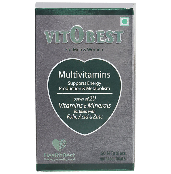 HealthBest VitOBest Tablet is formulated with the power of 20 vitamins and minerals fortified with folic acid and zinc. Vitamin A (palmitate) is beneficial to the body's vision, skin, bones, and other tissues. Vitamin A is a powerful antioxidant that protects cells from harm. Cholecalciferol aids in the absorption of calcium and phosphorus in the body. It's crucial to get enough vitamin D, calcium, and phosphorus to create and maintain healthy bones. | Key Ingredients: Power of 20 vitamin and minerals Folic acid Zinc | Key Benefits: Vitamin A (palmitate) is beneficial to the body's vision, skin, bones, and other tissues. Vitamin A is a powerful antioxidant that protects cells from harm Cholecalciferol aids in the absorption of calcium and phosphorus in the body. It's crucial to get enough vitamin D, calcium, and phosphorus to create and maintain healthy bones Vitamin E is an antioxidant that aids in the removal of free radicals, which are unstable compounds that cause cell harm. When you eat vitamin E, the immune system improves. Another significant advantage of vitamin E is that it lowers cholesterol levels Vitamin C is required for tissue growth and repair in all parts of the body Thiamine hydrochloride is a salt type of thiamine that is required for aerobic metabolism, cell development, nerve impulse transmission, and acetylcholine synthesis Riboflavin Sodium Phosphate, also known as vitamin G, is a component of the cofactors FAD and FMN and is necessary for a number of flavoprotein enzyme reactions, including the activation of other vitamins Niacinamide is essential for the health of the nervous system and the production of collagen in the skin Pyridoxine hydrochloride aids the body's conversion of food into fuel, metabolization of fats and proteins, nerve function and production of red blood cells Folic acid synthesises and restores DNA, functions as a cofactor in a variety of biological reactions, and is particularly important in assisting rapid cell division and development, such as in children to produce healthy red blood cells, as well as regulating anaemia Vitamin B 12 (methylcobalamin) helps to control anaemia, depression, celiac disease, and mental dysfunction Biotin, also known as vitamin H, is a B vitamin that belongs to the complex B group. Biotin aids the body's metabolization of fats and carbohydrates improves hair health and keeps the nervous system functioning properly | Directions For Use: 1 tablet per day or as directed. | Safety Information: Read the label carefully before use Keep out of reach of the children Store in a cool dry place This product is not intended to diagnose, treat or cure any diseases Comes with 24 months warranty