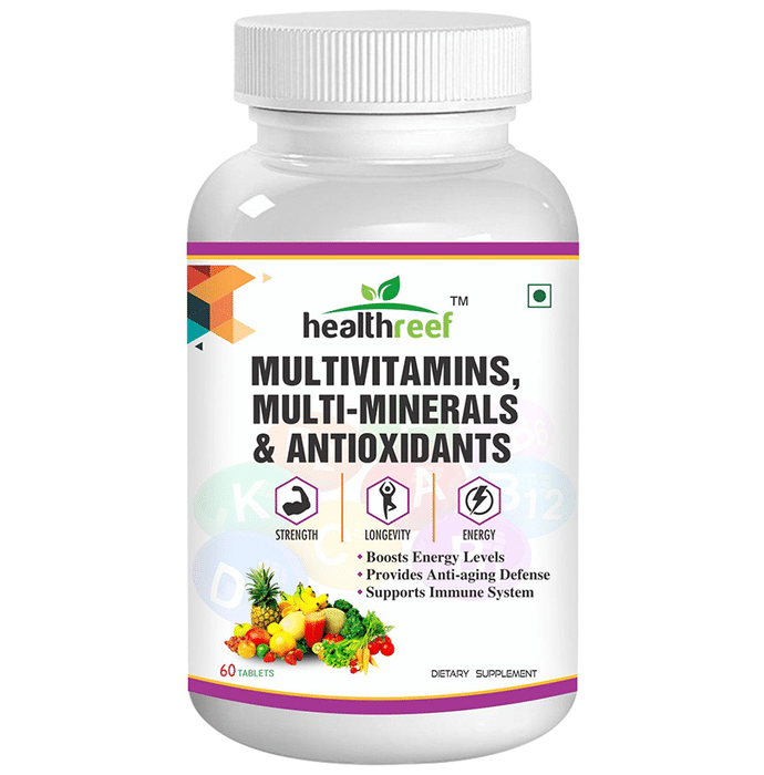 Healthreef Multivitamins, Multi-Minerals & Antioxidants Tablet gives over 20 vitamins, minerals, fruit, and plant extracts in one product, making it suitable for those who are looking to maintain general health and well-being. | Key Ingredients: Vitamin A Vitamin B1 Vitamin B2 Vitamin B3 Vitamin B5 Vitamin B6 Vitamin B12 Vitamin C Vitamin D3 Vitamin E Folic Acid Biotin Zinc Magnesium Manganese Iodine Copper Selenium Chromium | Key Benefits: It boosts energy levels It provides anti-aging defense It supports the immune system | Directions For Use: Take 1 tablet with food daily. For optimal use, take one tablet daily 20-30 minutes after a meal with a full glass of water or as directed by your healthcare professional. | Safety Information: Read the label carefully before use Store in a cool and dry place away from direct sunlight Keep out of reach of the children Do not exceed the recommended dose Do not use if you are pregnant or nursing a baby Individuals with known medical conditions should consult with a physician before using this or any other dietary supplement