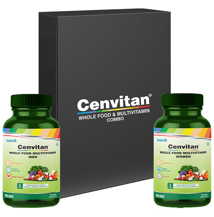HealthVit Combo Pack of Cenvitan Whole Food Multivitamin Men & Women Tablet (60 Each) contains multivitamins for men and women. Specially formulated Cenvitan Whole Food Multivitamin for Men and women is made from plant-based whole foods. The multivitamin supplement is fortified with real vitamins in a single tablet so that you get what is promised. These whole food multivitamin tablets help bridge some nutrient gaps so you can meet the recommended amount of nutrients. It may help increase energy and stamina levels, enhance nervous and immune systems, improve vision and antioxidant capabilities. | Key Ingredients: Vitamins and Minerals | Key Benefits: | Whole Food Multivitamin Men: It boosts energy and stamina levels It contains micronutrients and performance blends that play an important role in energy metabolism as these are required as functional parts of enzymes involved in energy release and storage It improves eye health It promotes heart health | Whole Food Multivitamin Women: It enhances the synthesis of collagen and helps delay signs of ageing It contains biotin, vitamin E and vitamin C to support healthy hair and skin It improves eye health It promotes heart health | Directions For Use: Use as directed. | Safety Information: Read the label carefully before use Store in a cool and dry place away from direct sunlight Keep out of reach of the children