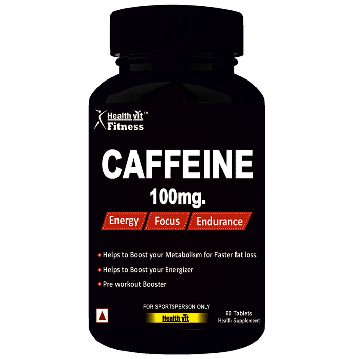 HealthVit Fitness Caffeine 100mg Tablet provides the energizing effects of caffeine with zero added sugar or calories to support your training needs without compromising your dietary goals. Caffeine triggers a range of performance-specific benefits, including improved focus, elevated alertness, faster reaction time, reduced fatigue, increased endurance and elevated mood. | Key Ingredients: Caffeine 100mg | Key Benefits: Caffeine can provide the energy you need to get through your workouts. It can also serve as a powerful energy boost for those days that you don’t seem to have the energy to make it through Caffeine quickly get absorbed in the blood that travels to the brain and improves concentration, focus and alertness Caffeine triggers a range of performance-specific benefits, including improved focus, elevated attention, faster reaction time, reduced fatigue, increased endurance and elevated mood Caffeine is the perfect alternative to energy drinks and energy shots and is a natural source of quick energy, focus and alertness to wake you up and get you going Regular consumption of caffeine improves the metabolism, can help in weight management and enhances the appetite Caffeine makes you burn fatter that can make you lose weight faster, along with improving energy production Mass gainer is 100% free from all kinds of banned substances and dope It can be used by sports personalities and athletes | Directions For Use: One tablet daily or as per the requirement or as per the direction of the physician. | Safety Information: Store in a cool and dry place away from direct sunlight Read the label carefully Keep out of reach of children