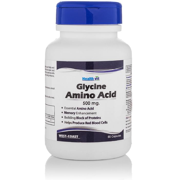 HealthVit Glycine Amino Acid 500mg Capsule Healthvit Glycine Amino Acid 500mg capsules contains glycine amino acid as its active ingredient. Key benefits of Healthvit DL-Phenylalanine 500mg capsule: Helping build lean muscle mass. Playing a role in the production of human growth hormone. Boosting mental performance and memory. Helping produce red blood cells. Improving sleep quality. Direction for use: As a dietary supplement for adults, take 1 or 2 capsules daily preferably at mealtime or as directed by health practitioner. Safety information: Pregnant, nursing women or individual taking any medications, consult the doctor before use. No artificial colour, flavours or preservative added, no chemical solvents. Use under medical supervision.