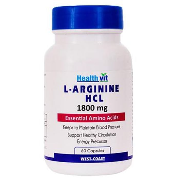 HealthVit L- Arginine 1800mg Capsule Healthvit L-Arginine HCL 1800 mg capsules contains L-Arginine Hcl as its active ingredient. Key benefits of Healthvit L-Arginine HCL 1800mcg capsule: High-dose L-arginine may help to maintain blood pressure levels. L-arginine Hcl is used for exercise performance, erectile dysfunction, immune system performance. Direction for use: As a dietary supplement for adults, take 1 or 2 capsules daily preferably at mealtime or as directed by health practitioner. Safety information: Pregnant, nursing women or individual taking any medications, consult the doctor before use. No artificial colour, flavours or preservative added, no chemical solvents. Use under medical supervision.