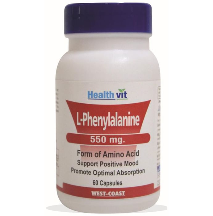 HealthVit L- Phenylalanine 550mg Capsule Healthvit L-Phenylalanine 550mg capsules contain L – Phenylalanine ( free form). L-Phenylalanine plays a key role in the biosynthesis of tyrosine, an amino acid required for the biosynthesis of the neurotransmitters dopamine and norepinephrine. Key benefits of Healthvit L-Phenylalanine 550mg capsules : Support positive mood. An amino acid required for the body (essential amino acid). Promote optimal absorption. Direction to use: Take one to two capsules daily between meals, or as directed by a healthcare practitioner. Safety information: Pregnant, nursing women or individual taking any medications, consult the doctor before use. No artificial colour, flavors or preservative added, no chemical solvents. Use under medical supervision.