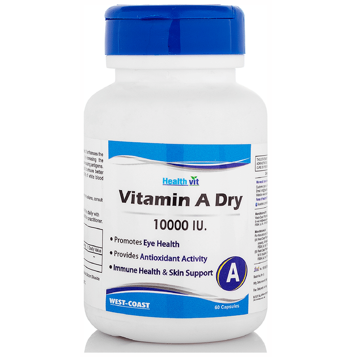 HealthVit Vitamin A Dry 10000IU Capsule Healthvit Vitamin A Dry 10000 IU capsule contains vitamins A(as acetate). Key benefits of Healthvit Vitamin A Dry 10000 IU capsules: It promotes eye health. Promotes immune health. Supports skin glow. Provides antioxidant activity. Direction to use: As a dietary supplement for adults, 1 or 2 capsules daily preferably at mealtime or as directed by health practitioner. Safety information: Pregnant, nursing women or individual taking any medications, consult the doctor before use. No artificial colour, flavours or preservative added, no chemical solvents. Use under medical supervision.
