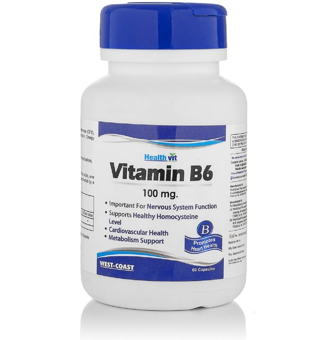 HealthVit Vitamin B6 100mg Capsule Healthvit Vitamin B6 100mg capsule contain viatmin B6 as active ingredient. Key benefits of Healthvit Vitamin B6 100mg capsules: Vitamin B6 is a water-soluble vitamin needed to release energy from food. It Essential for proper nerve function and immune system health. It plays a crucial role in the synthesis of neurotransmitters such as dopamine and serotonin. This helps the human body to withstand a number of infections. Vitamin B6 has a significant role to play in the treatment of premenstrual syndrome occurring in women. Direction to use: As a Dietary supplement for adults, 1 or 2 capsules daily preferably at mealtime or as directed by health practitioner. Safety information: Pregnant, nursing women or individual taking any medications, consult the doctor before use. No artificial colour, flavours or preservative added, no chemical solvents. Use under medical supervision.